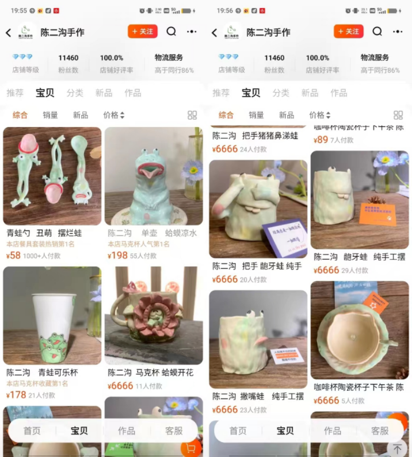 “当时只打算碰运气,没想到全卖完了。”感动之余,陈二沟开始以青蛙为创造灵感,做出凉水壶、水杯、茶盘等各式商品。他透露,从10月青蛙勺破圈以来,两个月他的收入已经超过20万元。
