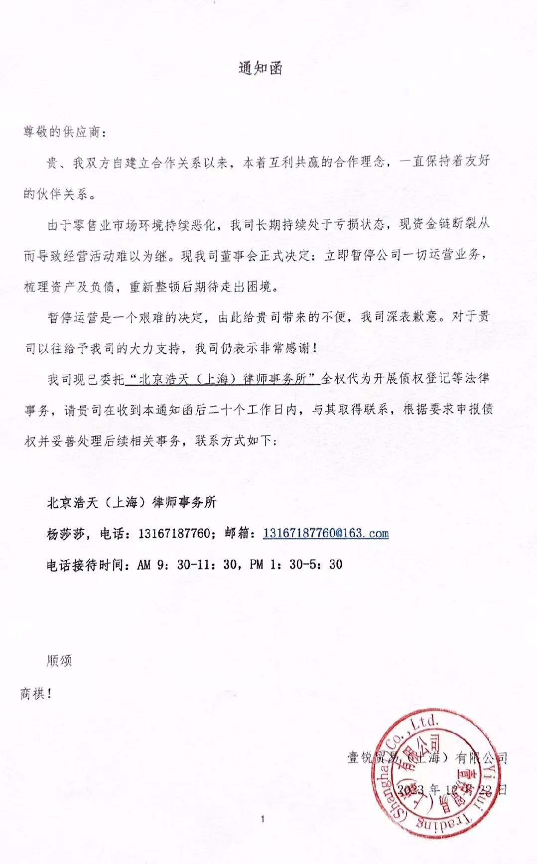 一份供应商《通知函》里,比宜德运营公司壹锐贸易(上海)有限公司坦承停业原因是:零售环境持续恶化,长期亏损,资金链断裂,导致经营活动难以为继。