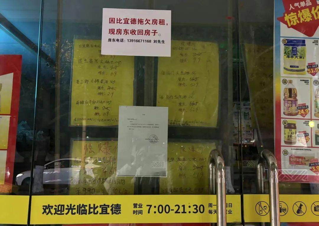 而在一家比宜德停业的店门上,张贴“因比宜德拖欠房租,现房东收回房子”的小广告,寻求新租户。