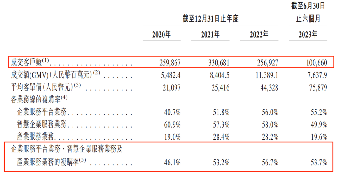 与此同时,公司的复购率在今年上半年也开始松动。2020年-2022年,业务复购率分别为46.1%、53.2%和56.7%。至2023年6月30日时,这一数字为53.7%。