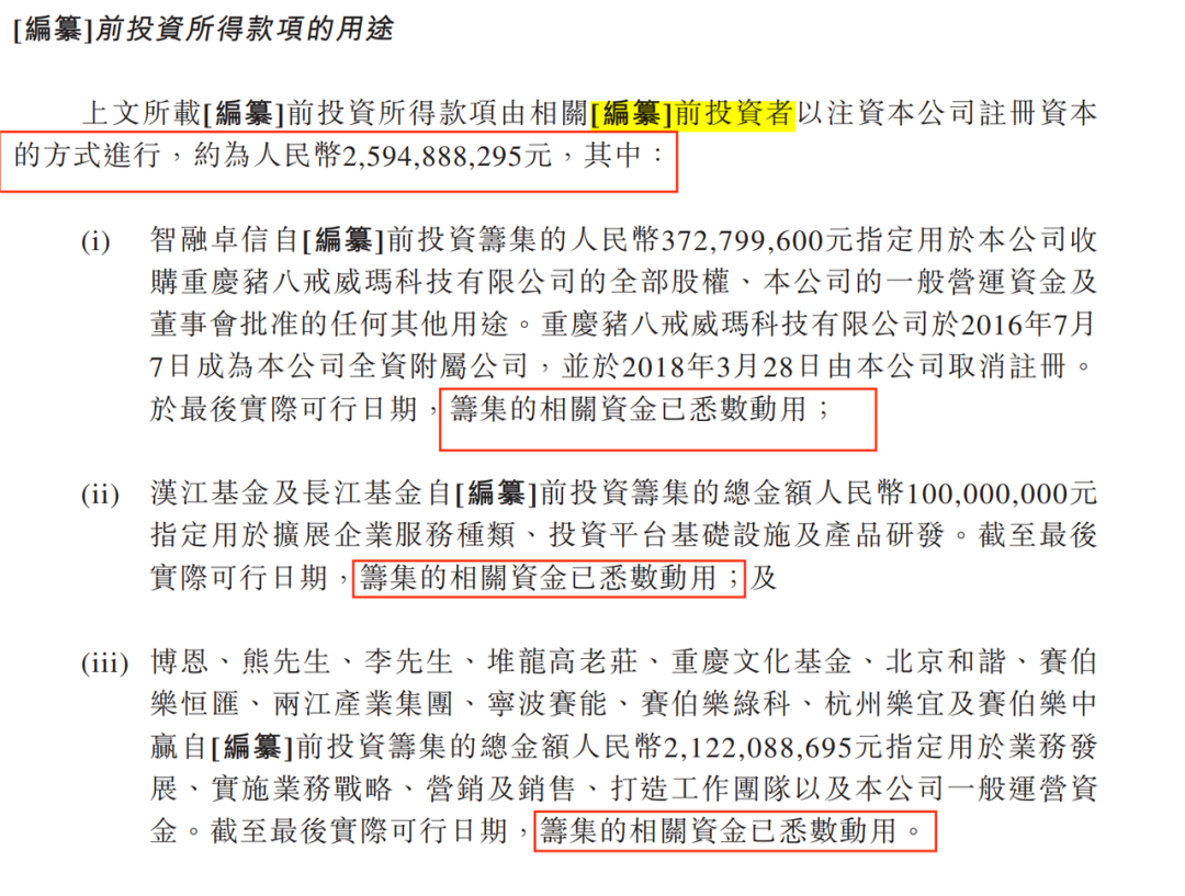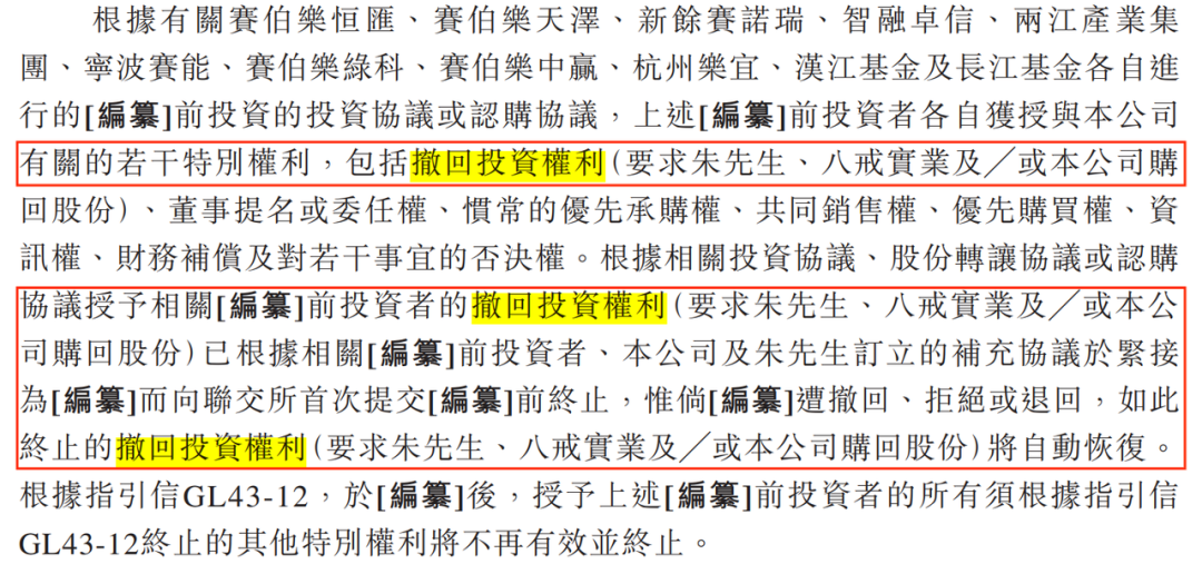 招股书显示,长江基金、汉江基金等部分投资者签署的协议中包含一项撤回投资权利。这一权利在猪八戒首次向港交所提交招股书前终止,但是若遭撤回、拒绝或退回,终止的撤回投资权利将自动恢复,上述投资者有权要求猪八戒创始人朱明跃、八戒实业及/或猪八戒购回股份。