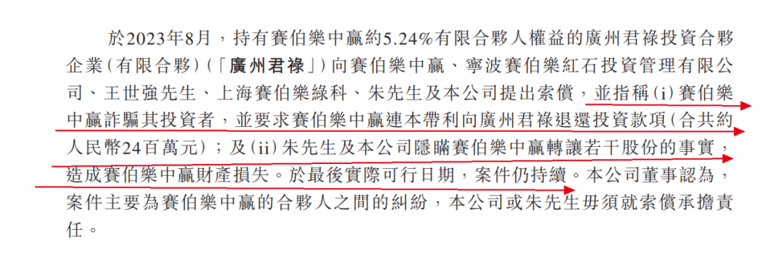 2023年8月,持有赛伯乐中赢约5.24%有限合伙人权益的广州君禄向赛伯乐中赢、宁波赛伯乐红石投资管理有限公司、王世强、上海赛伯乐绿科、朱明跃及猪八戒提出索偿,指称赛伯乐中赢诈骗其投资者,要求赛伯乐中赢连本带利向广州君禄退还投资款项2400万元。