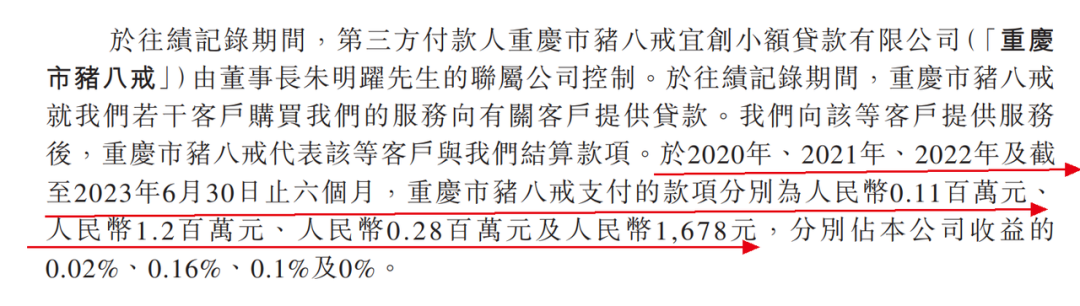 例如,在报告期内部分,一家名为重庆市猪八戒宜创小额贷款有限公司(以下简称:猪八戒小贷)为猪八戒客户提供贷款服务,这也是由朱明跃的联属公司所控制。