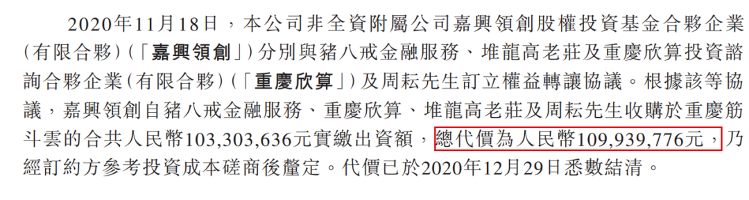 猪八戒并未披露剥离时的价格,但重新购回股权耗资上亿。2020年11月18日,猪八戒非全资附属公司嘉兴领创分别与猪八戒金融服务、堆龙高老庄、重庆欣算及周耘订立权益转让协议,收购重庆筋斗云1.03亿元实缴出资额,总代价为1.10亿元。