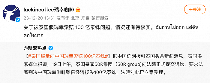 瑞幸回应被泰国瑞幸索赔20亿元人民币