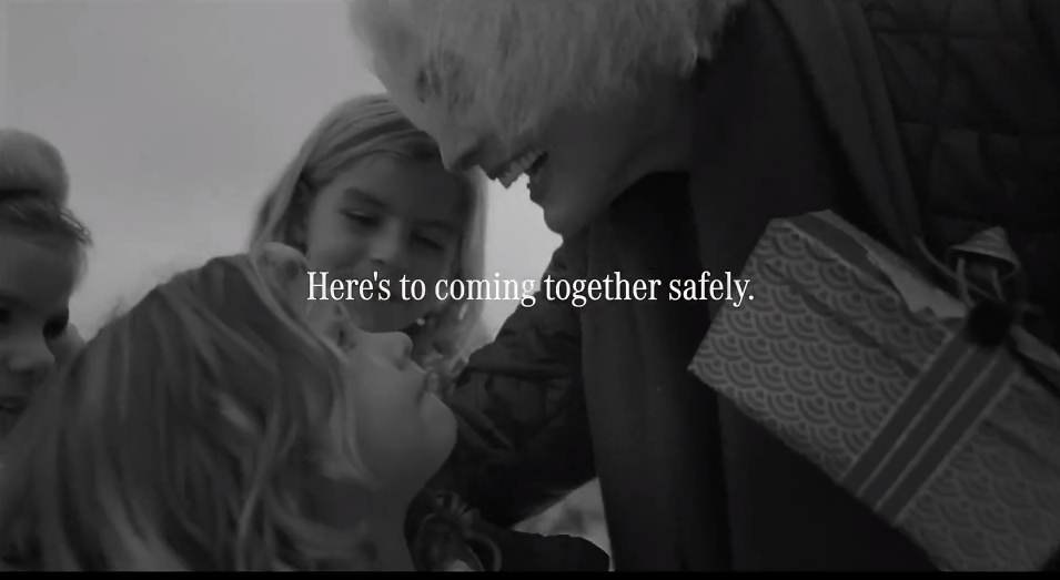 最后,广告以“Here’s to coming together safely(致敬我们安全在一起),Happy Holidays, with Love”(节日快乐、带着爱)为点睛,在总结故事的同时,潜移默化建立了故事与产品的强关联。