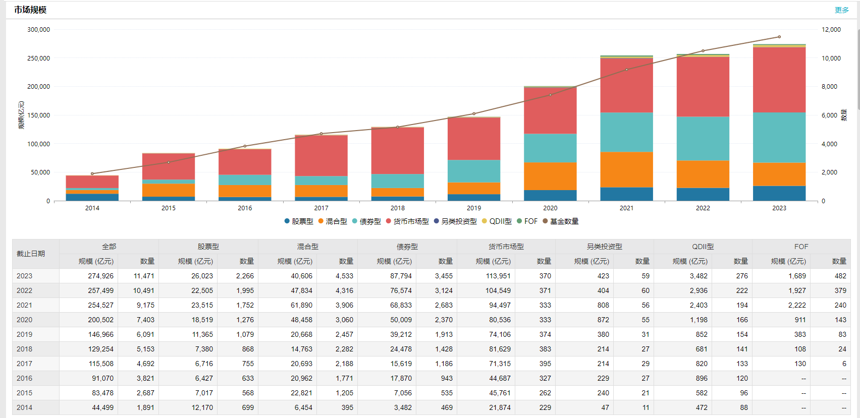 同样,混合型基金发行近两年来也经历了“断崖跳水”的情况。截至2023年12月22日,年内新成立混合型基金数量从2022年的479只减少至351只,募集份额从2022年的2745.56亿份减少至1500.80亿元,平均发行份额也从5.73亿份下降至4.28亿份,创下历史新低。究其原因,自2021年以来,随着市场的震荡下行,投资者风险偏好降低,新发基金也从以混合型为主导转变为以债券型基金为主导。近两年来,混合型基金市场占比持续走低,分别大幅下降至2022年和2023年的18.59%和13.61%。
