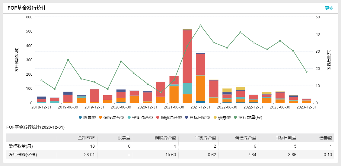 值得关注的是,近两年来,除了主动偏股产品外,FOF也因缺乏赚钱效应而陷入低迷。据Wind统计,截至2023年12月22日,按成立日期统计,年内新成立FOF基金共计114只,募集份额合计为233.58亿份,平均发行份额约2.05亿份。其中,FOF发行份额已创下近五年的最低纪录,而平均发行份额更是创下历史新低。从以往年度发行数据来看,2021年全年,FOF发行份额曾突破千亿份大关,高达1194.86亿份,创下历史新高,对应的平均发行份额为12.71亿份,为历史次高水平。