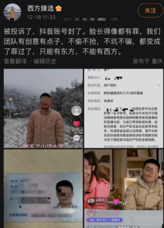 “西方臻选”直播间负责人声称:账号遭“东方甄选”举报下线。