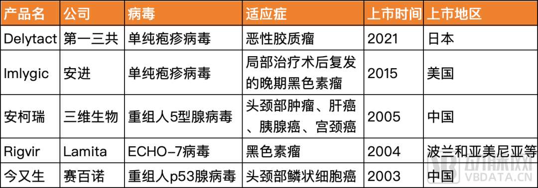 溶瘤病毒已有百年历史,但唯一在世界范围获广泛认可并且通过FDA批准的溶瘤病毒是安进的Imlygic。FDA自2015年批准Imlygic后,便再也没有批准一款溶瘤病毒产品。其他四款在不同国家地区上市的药品分别为赛百诺的今又生、Latima的Rigvir、三维生物的安柯瑞以及第一三共的Delytact。