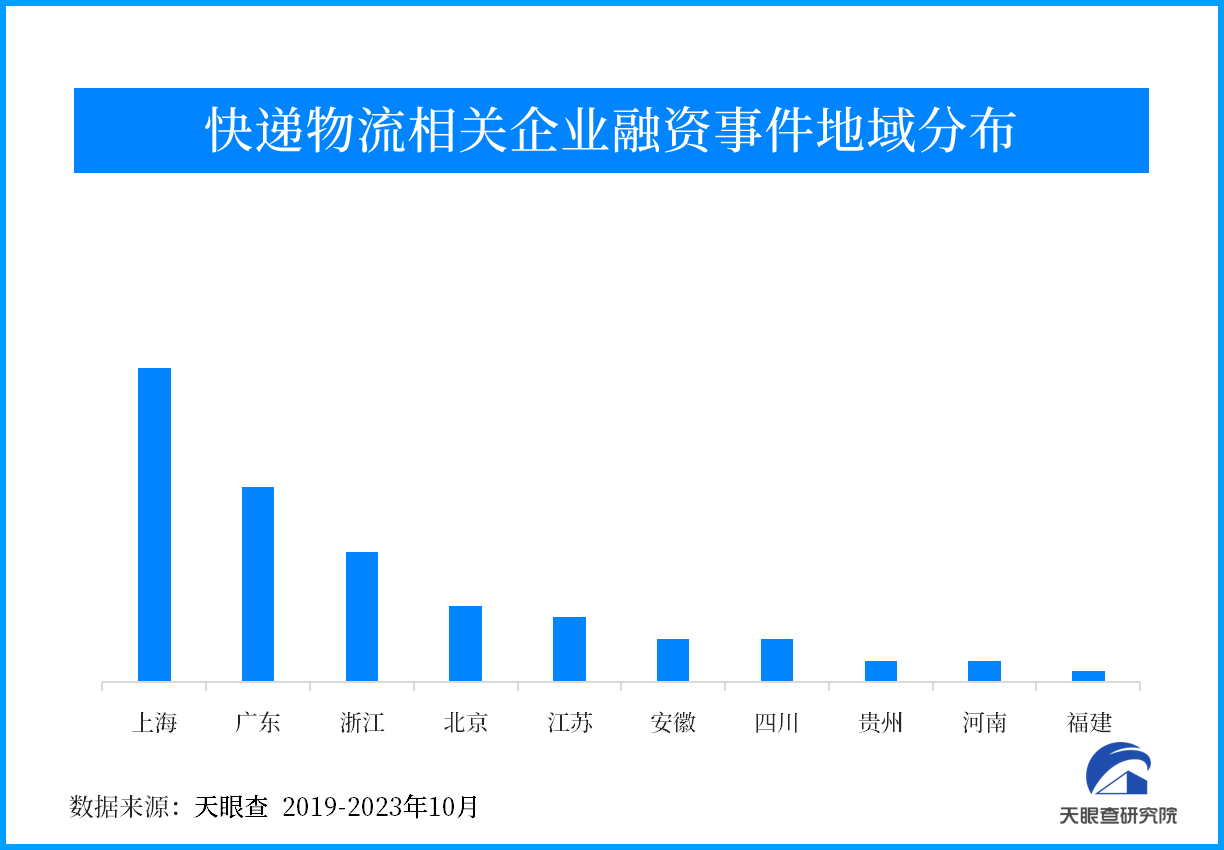 从融资事件的地域分布来看,上海、广东以及浙江,三地融资事件位居前列,分别拥有29起、18起以及12起。这三个典型省市有着较多的共同点,上海与浙江,尊贵的“包邮区”,快递企业无法不重视的区域,另外三省市制造业、外贸经济均较为发达,尤其是跨境电商,企业出海的需求加大,快递物流作为基础实施,其作用不言而喻,众多创业企业选择落户这三个地区就很“正常”了。