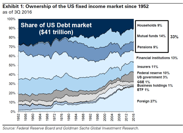 而具有在自由配置资产能力的投资者,如家庭,养老基金和共同基金,持有13万亿美元的债券,约占41万亿美元国内债券市场的三分之一。