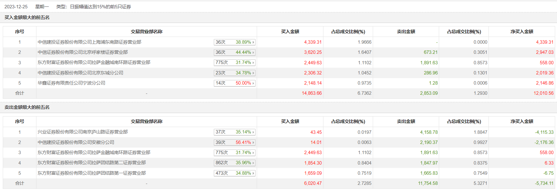 捷荣技术12月25日涨停,全天换手率达23.18%,振幅达19.99%。龙虎榜数据显示,营业部席位合计净买入5718.46万元。其中,中信建投证券上海浦东南路证券营业部、中信证券北京呼家楼证券营业部分别买入4339.31万元、3620.25万元;兴业证券南京庐山路证券营业部、中信建投证券安徽分公司分别卖出4158.78万元、2190.37万元。