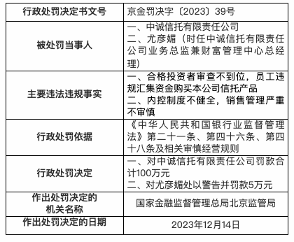 12月25日,国家金融监督管理总局北京监管局行政处罚信息公开表显示,2023年12月14日,中诚信托有限责任公司被处罚款合计100万元,时任中诚信托有限责任公司业务总监兼财富管理中心总经理尤彦媚被处以警告并罚款5万元。主要违法违规事实为:合格投资者审查不到位,员工违规汇集资金购买本公司信托产品;内控制度不健全,销售管理严重不审慎。
