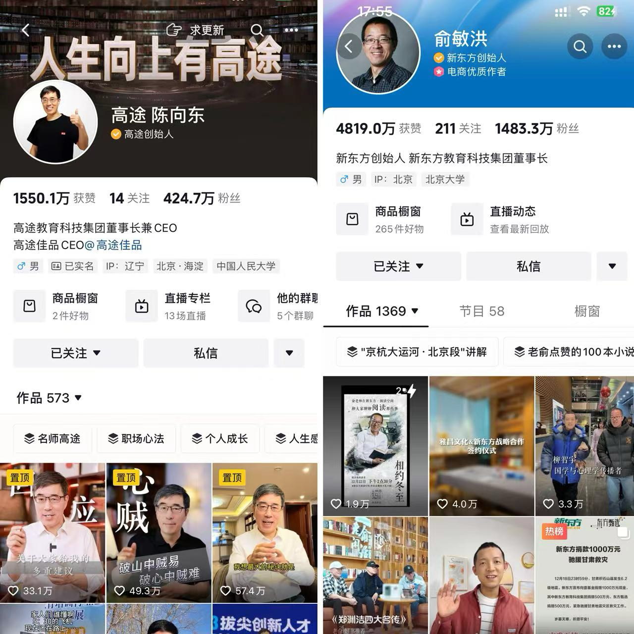 此外,陈向东在2023年1月正式开通了自己的个人账号,名为“高途佳品CEO”,以成长、职场、创业等话题为内容,与俞敏洪个人账号内容定位相仿,如今该账号粉丝数已经达到了424.7万。