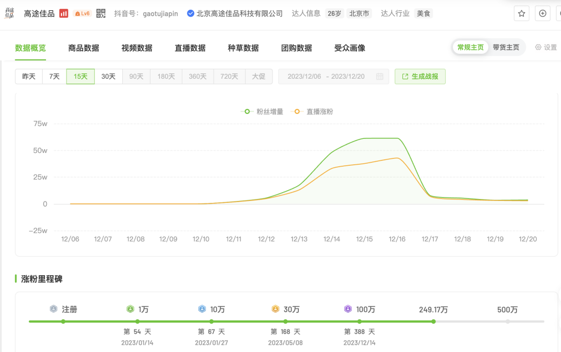 飞瓜数据显示,12月11日之前,高途佳品的粉丝人数长期停滞在32万人,而自12月11日开始,高途佳品账号涨粉速度开始飙升,七天涨粉186万,截至发稿,高途佳品抖音直播间粉丝量已经达到255.5万。