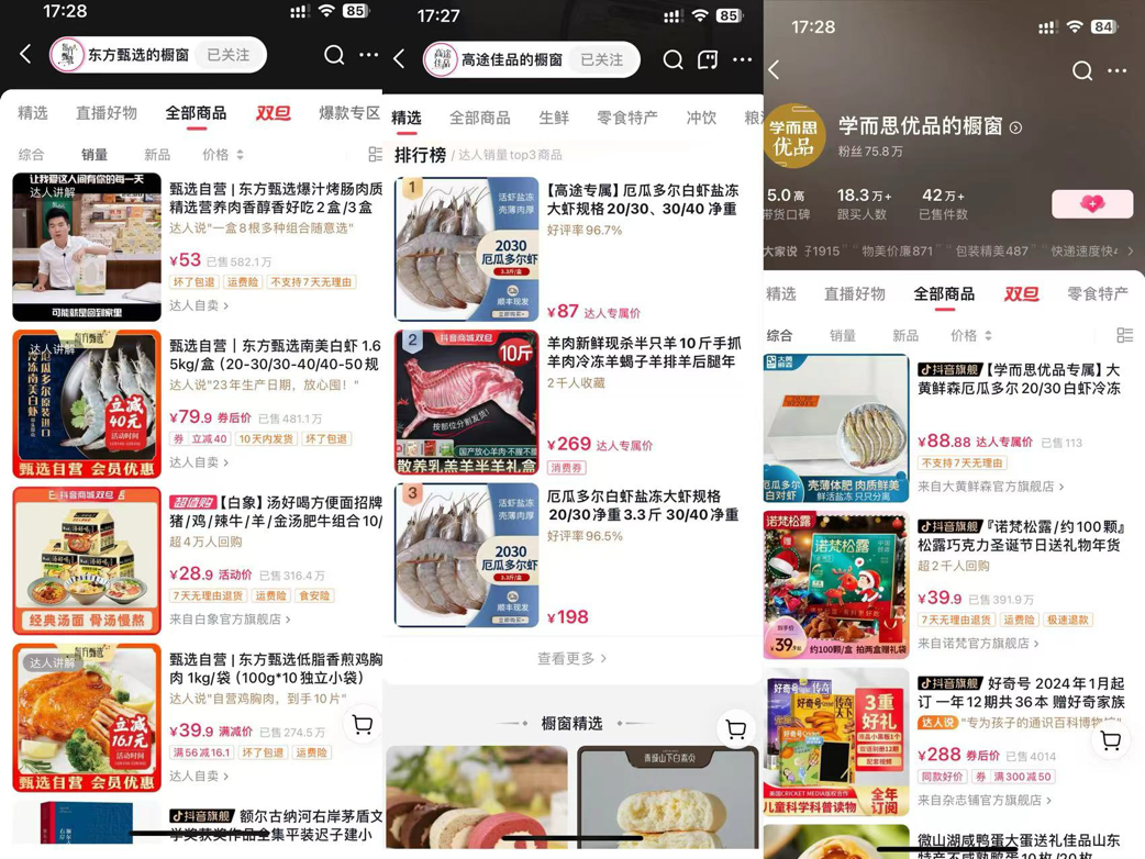 就选品来看,三个直播间都主打“农产品”相关的品类,比如厄瓜多尔大虾、冷冻羊肉以及苹果、橙子等水果类。