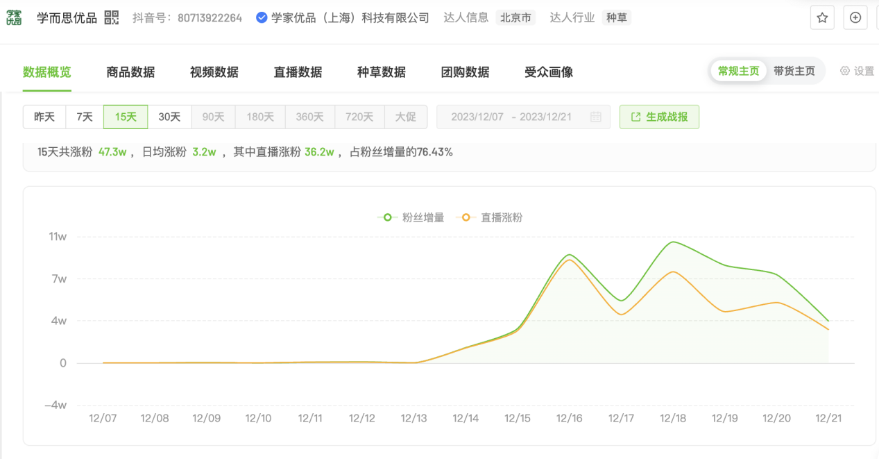 虽然“泼天的富贵”来的晚了些,但学而思优品也吃到了这波流量红利。飞瓜数据显示,12月13日之前,学而思优品的粉丝人数长期停滞在20万出头,而自12月14日开始,学而思佳品账号涨粉速度开始飙升,七天涨粉近44万,截至发稿,学而思佳品抖音直播间粉丝量已经达到80万。