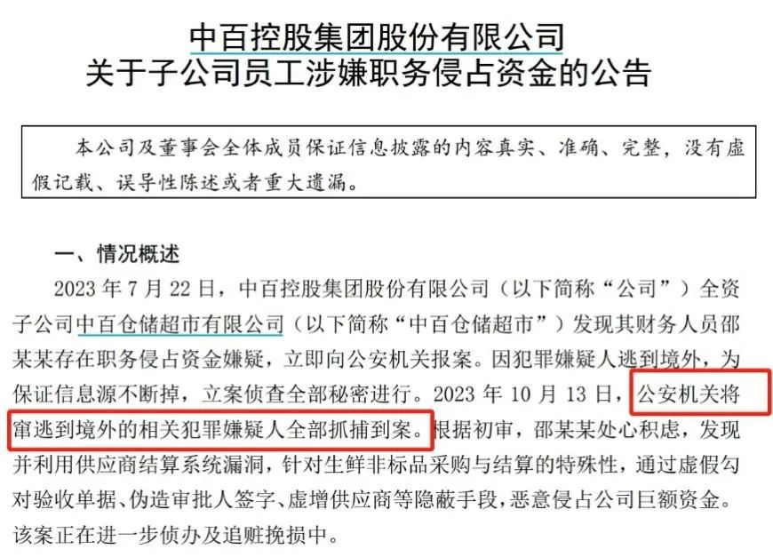 12月19日,中百集团(000759.SZ)公告称,于7月22日发现全资子公司中百仓储超市财务人员邵某某存在职务侵占资金嫌疑,立刻向公安机关报案。10月13日,公安机关已将窜逃到境外的相关犯罪嫌疑人全部抓捕到案。