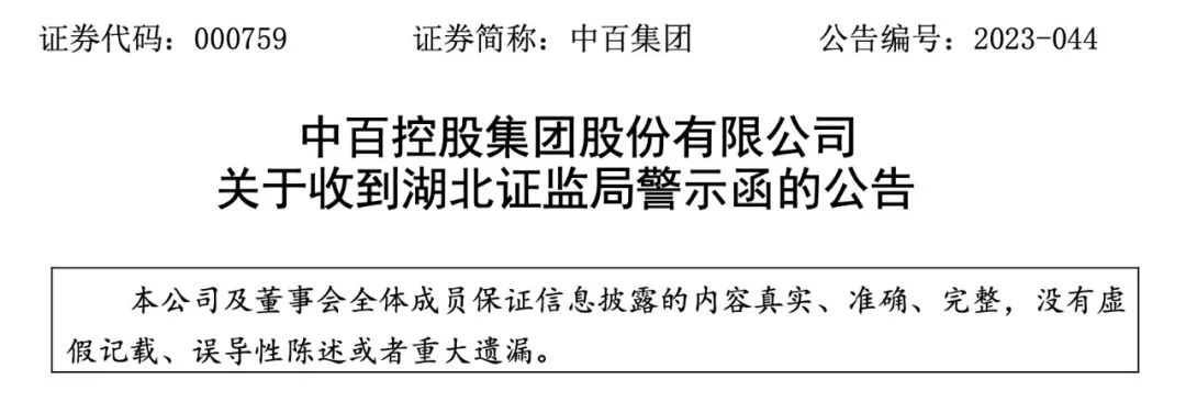 12月20日,湖北证监局就对中百集团出具了警示函,认为中百集团员工职务侵占事项,公司应当立即披露,而如今才发布公告,存在信息披露不及时的情况。因此决定对中百集团以及公司董事长汪梅、总经理张俊、副总经理及主管会计工作负责人胡剑、董秘李慧斌采取出具警示函的行政监管措施,并记入证券期货市场诚信档案。