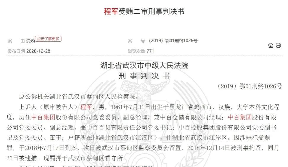 2020年末,裁判文书网披露了程军受贿案的二审刑事判决书。程军曾是中百集团的董事、副总经理,也曾是中百仓储超市的总经理。