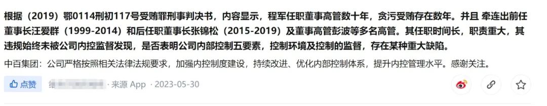 在如此长的受贿周期内,程军的违规行为一直未被公司内控监督发现。也难怪会有投资者质疑:“该案件是否表明公司内部控制五要素,控制环境及控制的监督,存在某种重大缺陷?”