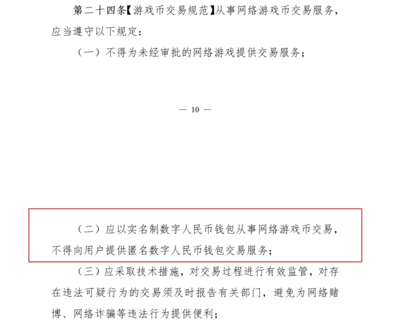 近日,国家新闻出版署发出通知就《网络游戏管理办法(草案征求意见稿)》公开征求意见。其中“游戏币交易规范”提到:“应以实名制数字人民币钱包从事网络游戏币交易,不得向用户提供匿名数字人民币钱包交易服务。”