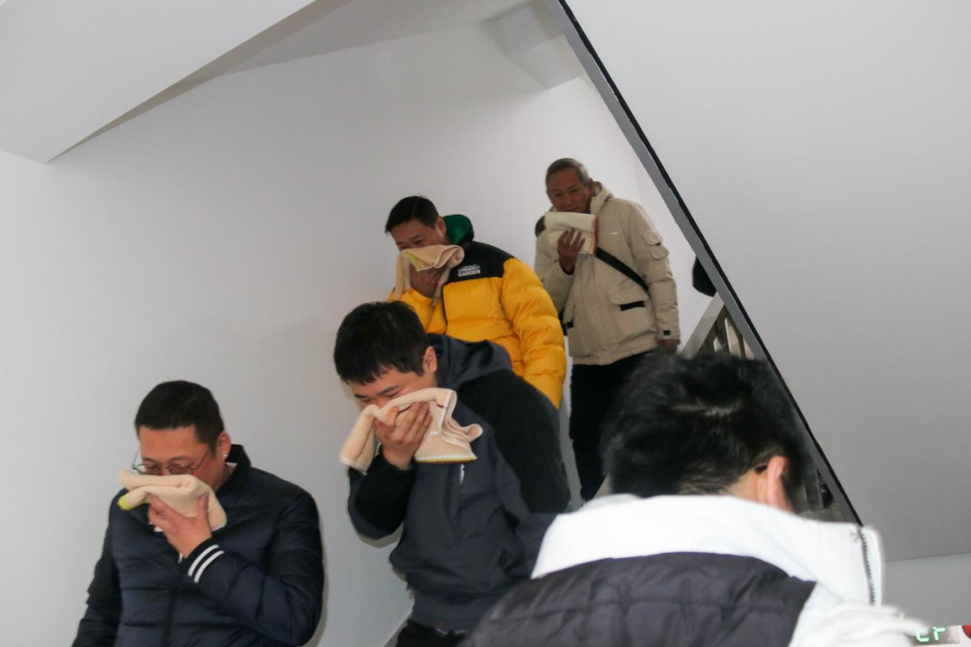 演练现场,当公寓响起消防报警与广播后,创寓消防小分队迅速到达着火楼层疏散租户。大家听从现场工作人员指挥,用毛巾捂住口鼻并弯腰,有序从消防通道撤离至紧急疏散点。工作人员清点现场人数后,向总指挥汇报。