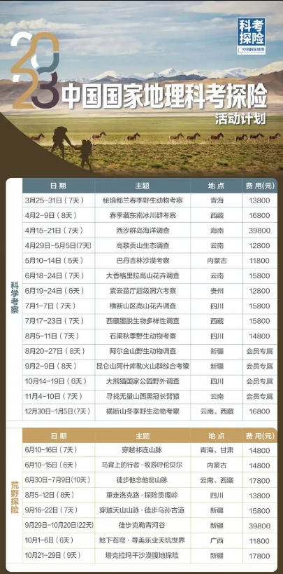 在结合20多年来野外经验和线路积累下,中国国家地理科学考察部升级推出了科学考察、荒野探险系列主题活动,让旅行者实现对自然地理的探索欲。而在2022年,科学考察部以获取新知识、感受新体验,收获新视角为目的,推出“知识型主题旅行”——“新知旅行”板块。在结合不同类型的目的地资源,整合读者感兴趣的地理、人文内容,以及理念的不断升级和发展下,“中国国家地理科学考察部”目前包含科学探险、新知旅行、青少出行三大板块系列的主题活动,打造了数条科学考察旅行线路,让科考旅行走进更多的人群。