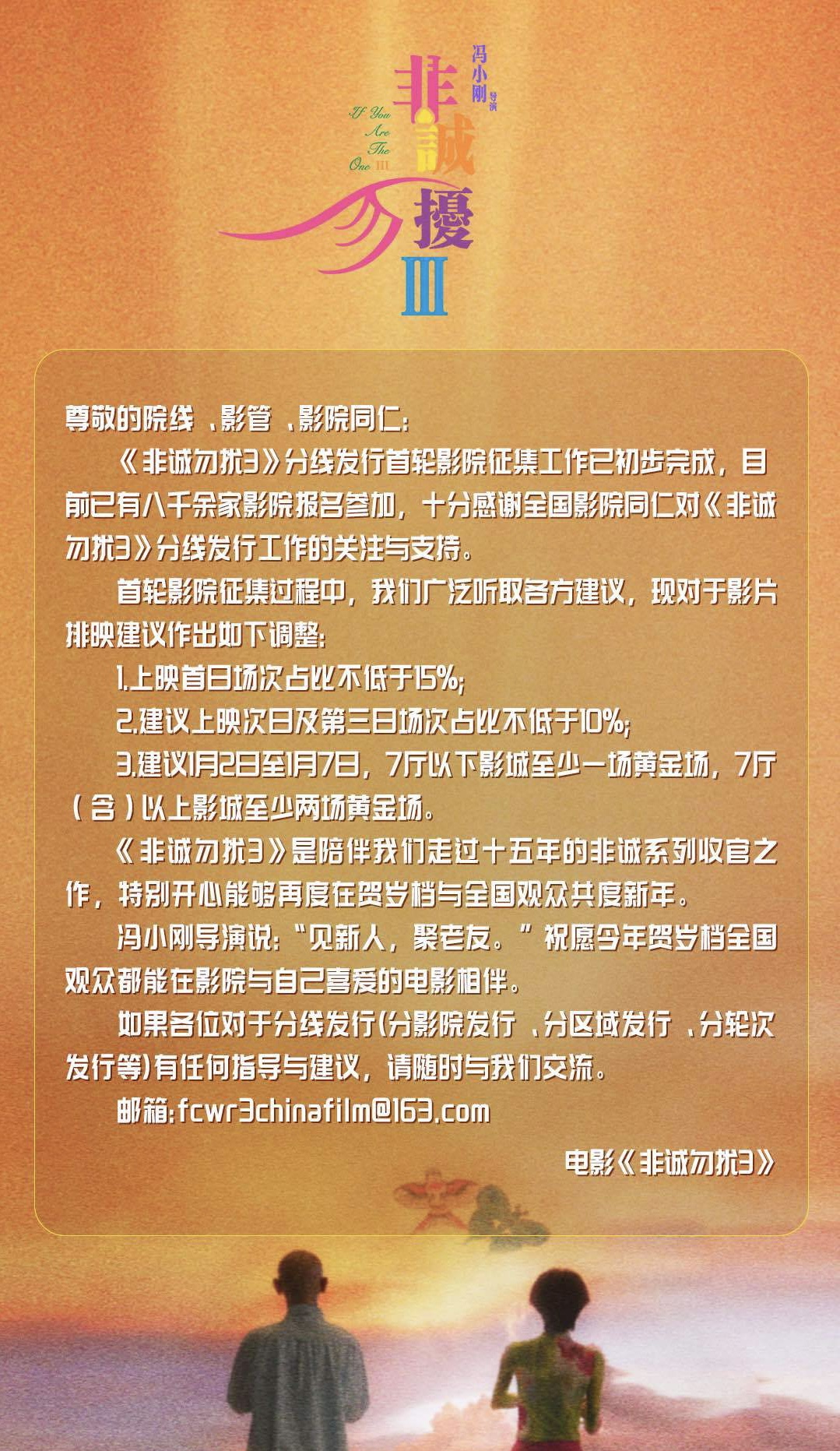 《非诚勿扰3》关于分线发行提出了几点合作建议,要求上映首日场次占比不得低于15%、次日及第三日不得低于10%,上映第三日至第九日,7厅以下的影院必须要安排一场黄金场,7厅以上的影院至少两场黄金场,合作门槛定得非常高。