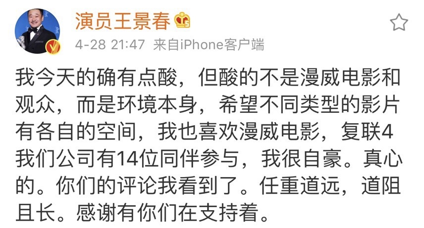 王小帅的《地久天长》就是最好的例子,横扫国内外各大电影奖项,毫无疑问是一部非常优秀的影片,但作为一部文艺片,受众有限,影院不赚钱就不会排片,当时恰好撞上超级商业片《复仇者联盟4》上映,占据了国内影院80%的排片,而《地久天长》的排片则可以忽略不计,男主角王景春直接微博发文开喷表达不满。