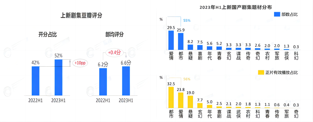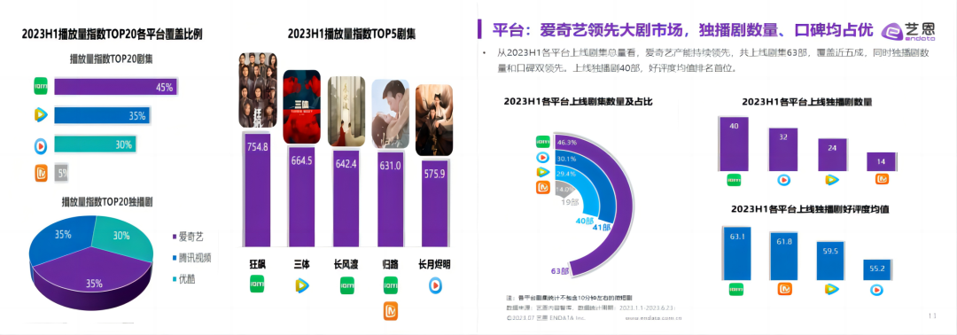 艺恩数据也显示,2023H1各平台上线剧集数量、市占比、独播数量、好评均值,各项指标桃厂都稳占王座。