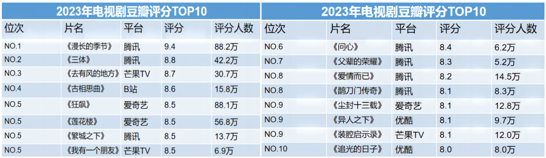 在2023年国剧豆瓣评分TOP10(共16部)中,鹅厂就是让人望尘莫及的存在了,不仅占据7席,《漫长的季节》《三体》更独占状元、榜眼之位,此外,爱奇艺和芒果各占3部,优酷2部,B站1部。
