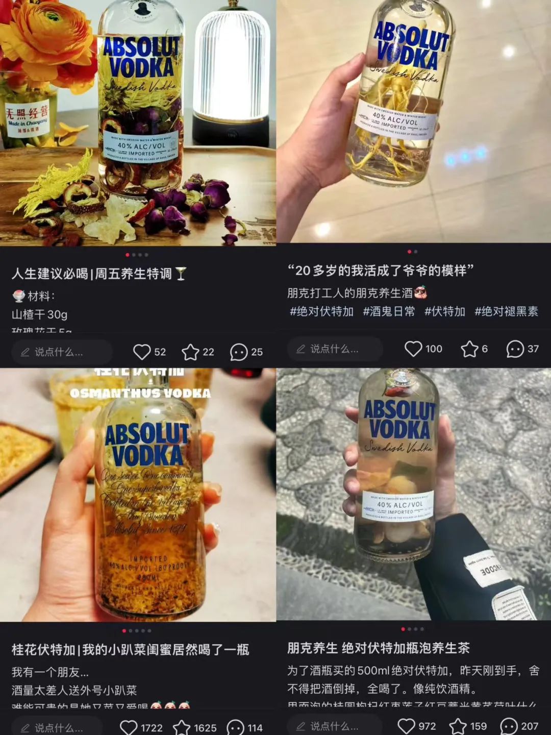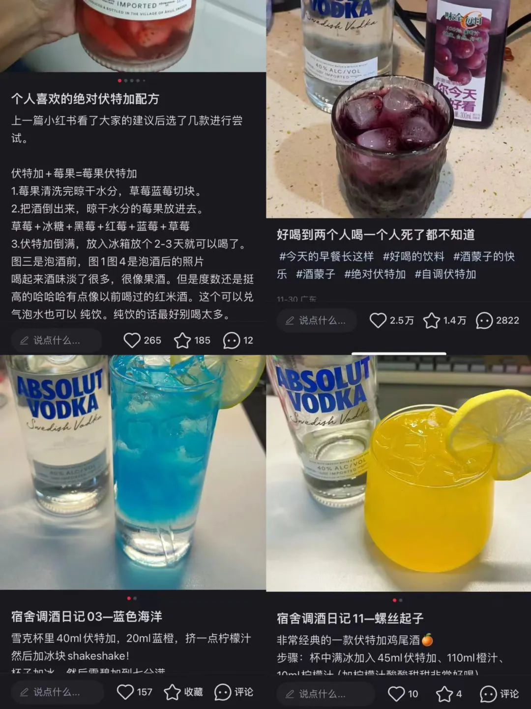 在小红书,各种“魔改”绝对伏特加、果立方搭配法则的笔记也频频出现,这些高度酒,有几分当年燕麦奶席卷国内市场时的样子,成为了年轻人手中的“diy神器”。