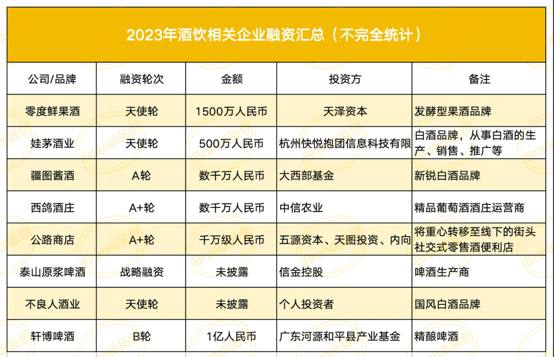 据iBrandi品创不完全统计,截止目前,2023年的投融资市场,酒饮相关项目共发生8起融资,而其中,仅有一起近日刚刚披露的融资的「零度鲜果酒」与低度酒有关。