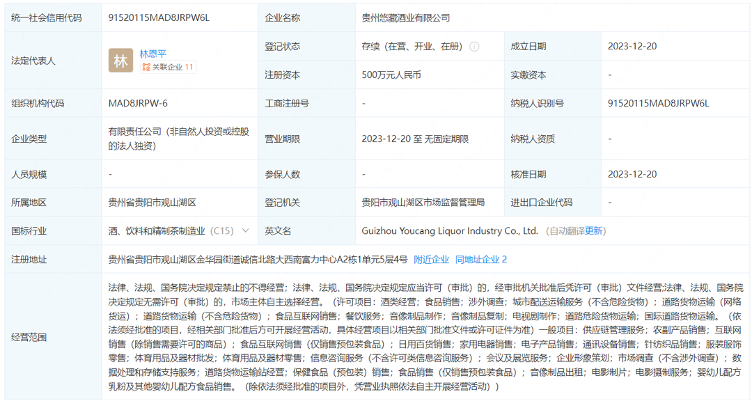 贵州悠藏酒业有限公司工商信息(图源:企查查)