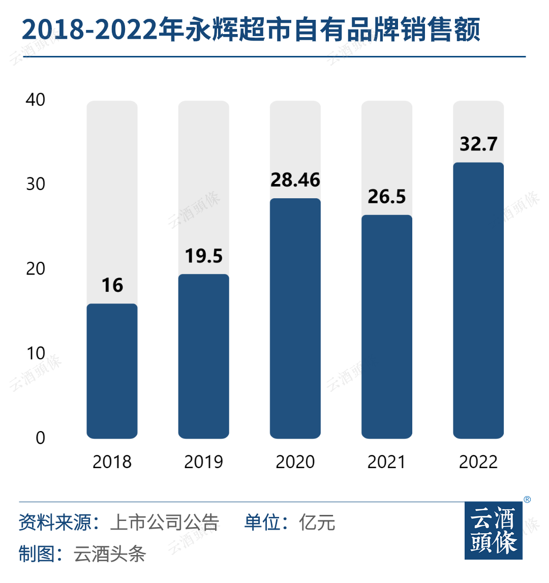 2022年,永辉超市自有品牌销售额达32.7亿元,同比增长23.40%,据永辉超市2020年报,当年其“核心品类中17个大类取得双位数的自有品牌渗透率,同时具备高于大盘毛利贡献”。