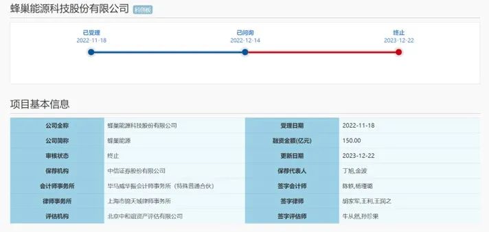 12月22日,据上交所官网信息,蜂巢能源及其保荐人中信证券撤回发行上市申请。根据相关规定,上交所终止其发行上市审核。科创板在审最大IPO项目宣告终止。
