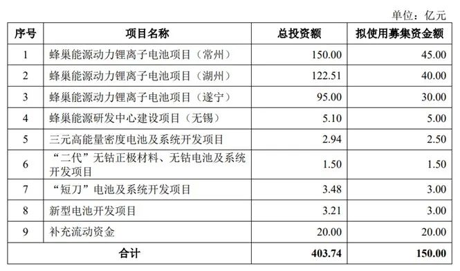 招股书显示,蜂巢能源此次IPO拟募资150亿元,计划用于常州、湖州、遂宁三地的锂电池项目建设、无锡研发中心建设以及三元高密度电池、无钴电池、“短刀”电池、新型电池等锂电池开发以及补充流动资金。