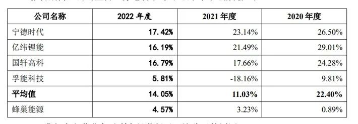 此外,蜂巢能源极低的毛利率在锂电池行业中备受关注。据悉,蜂巢能源在2019年、2020年、2021年和2022年的主营业务毛利率分别为 6.64%、0.89%、3.23%及 4.57%,显著低于可比公司毛利率平均值 28.06%、22.40%、11.03%、14.05%。在2021年和2022年,蜂巢能源甚至对一些客户的产品毛利率为负。