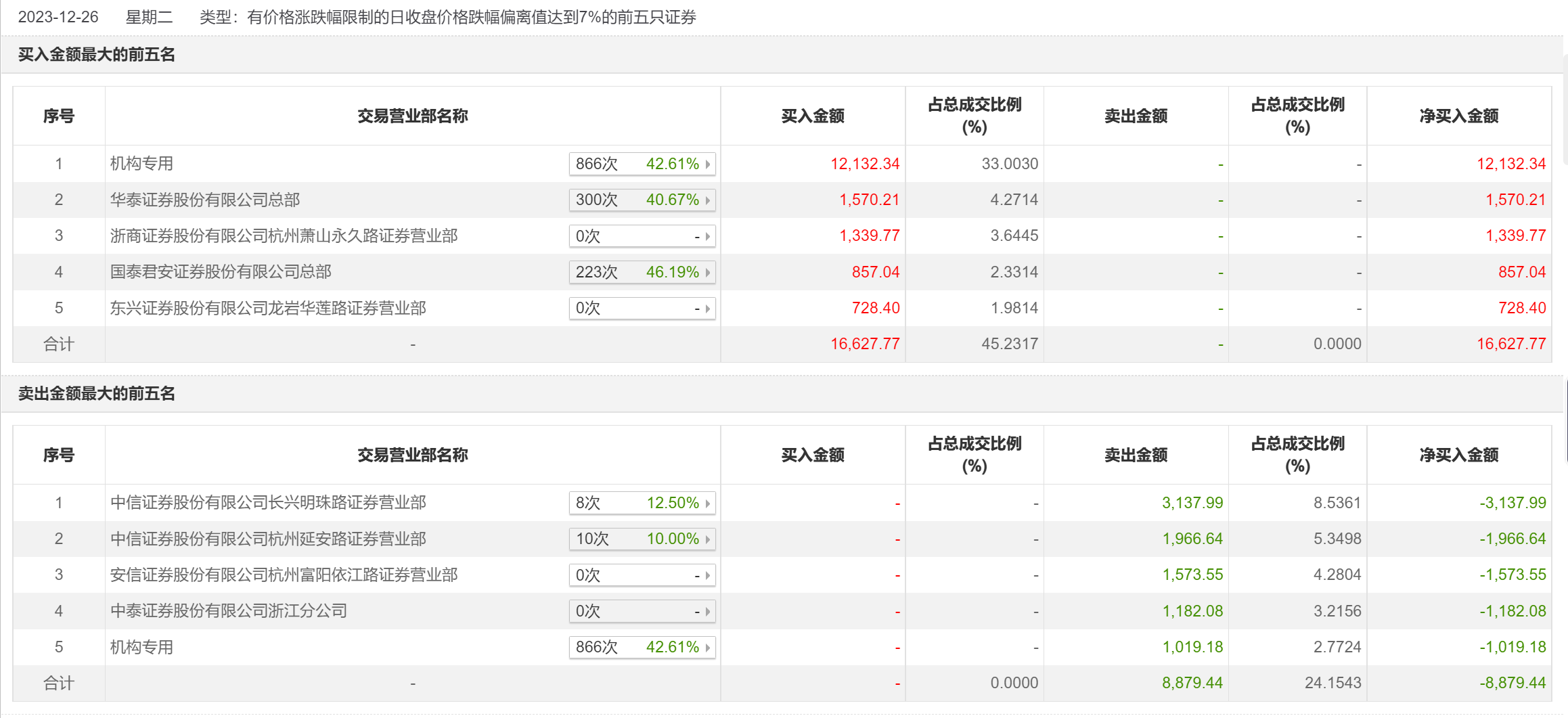 12月26日,华达科技今日跌停,全天换手率达3.9%,振幅达14.85%。龙虎榜数据显示,营业部席位合计净买入7748.33万元。其中,机构买入1.21亿元,卖出1019.18万元,合计净买入1.11亿元。此外,中信证券长兴明珠路证券营业部、中信证券杭州延安路证券营业部分别卖出3137.99万元、1966.64万元;华泰证券总部、浙商证券杭州萧山永久路证券营业部分别买入1570.21万元、1339.77万元。