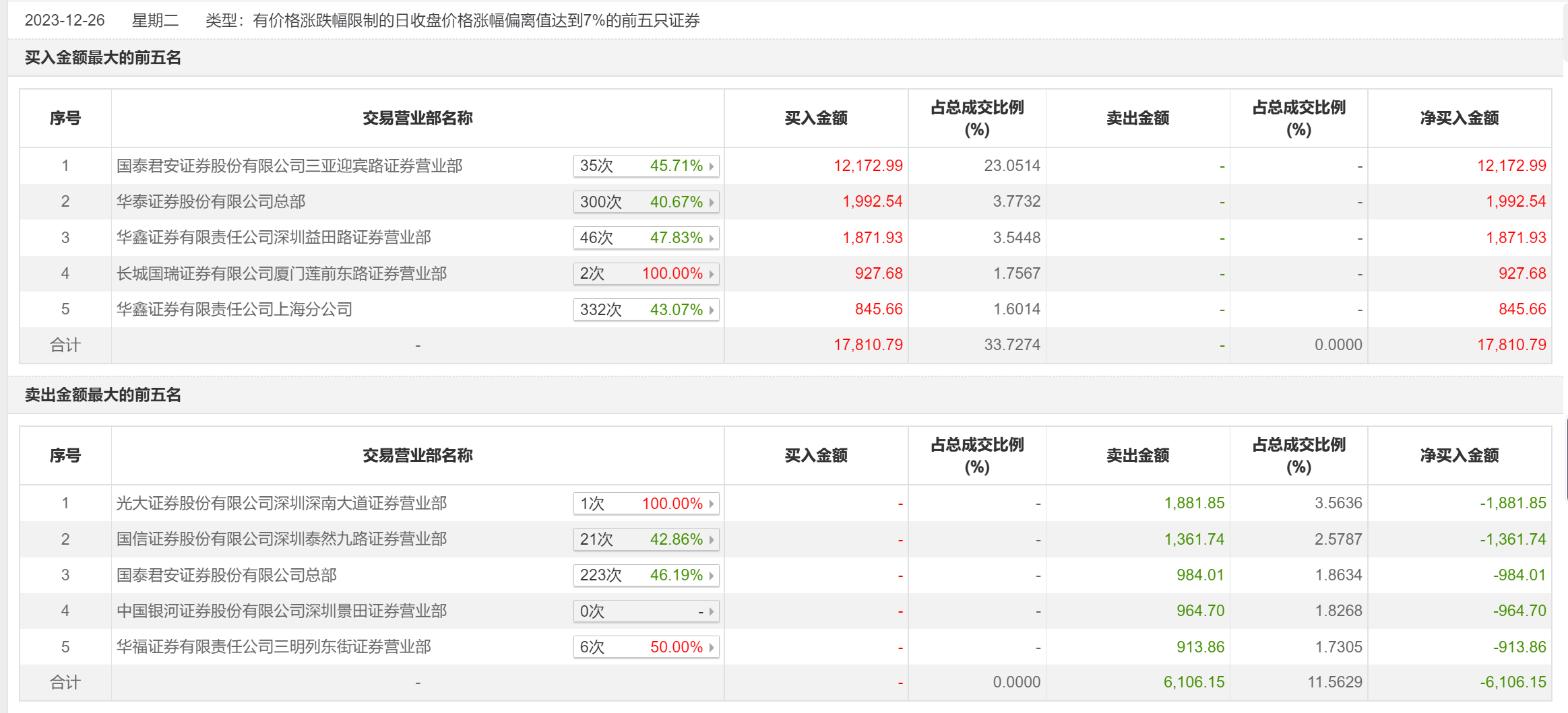 12月26日,祥龙电业今日涨停,全天换手率达13.54%,振幅达10.88%。龙虎榜数据显示,营业部席位合计净买入1.17亿元。其中,国泰君安证券三亚迎宾路证券营业部、华泰证券总部分别买入1.22亿元、1992.54万元;光大证券深圳深南大道证券营业部、国信证券深圳泰然九路证券营业部分别卖出1881.85万元、1361.74万元。