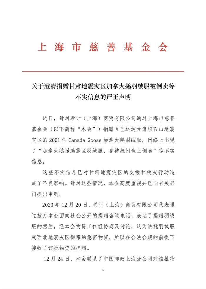 12月26日,上海市慈善基金会发布声明,近日,针对希计(上海)商贸有限公司通过上海市慈善基金会捐赠且已运达甘肃积石山地震灾区的2001件Canada Goose 加拿大鹅羽绒服,网络上出现了“加拿大鹅援助震区羽绒服,竟被挂闲鱼上倒卖”等不实信息。这些不实信息已对甘肃地震灾区的支援和救灾行动造成了不良影响。针对这些情况,本会高度重视并已向有关部门提出申明。