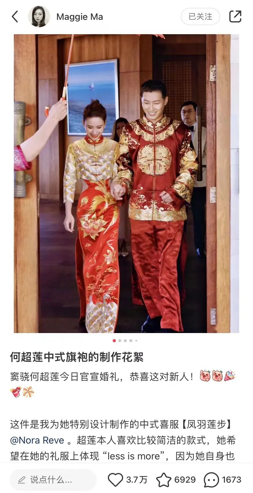 之后,品牌陆续接到超模游天翼、宣云Luna这两单有影响力的中式婚服订单,而那件何超莲的中式婚服,被中小商家copy,已经成为了不少人的婚礼同款。