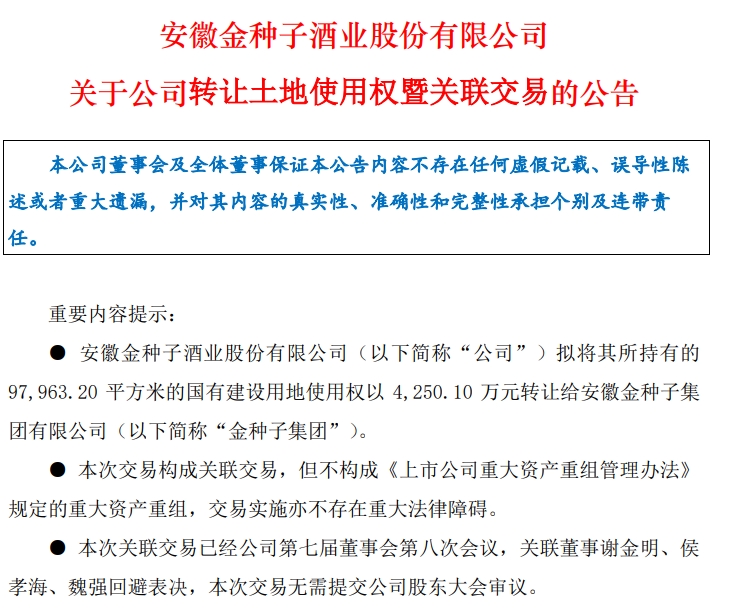 同样的事情也发生在今年,12月12日,金种子酒发布公告表示,拟将其所持有的约10万平方米的国有建设用地使用权以约4250万元的价格转让给金种子集团。