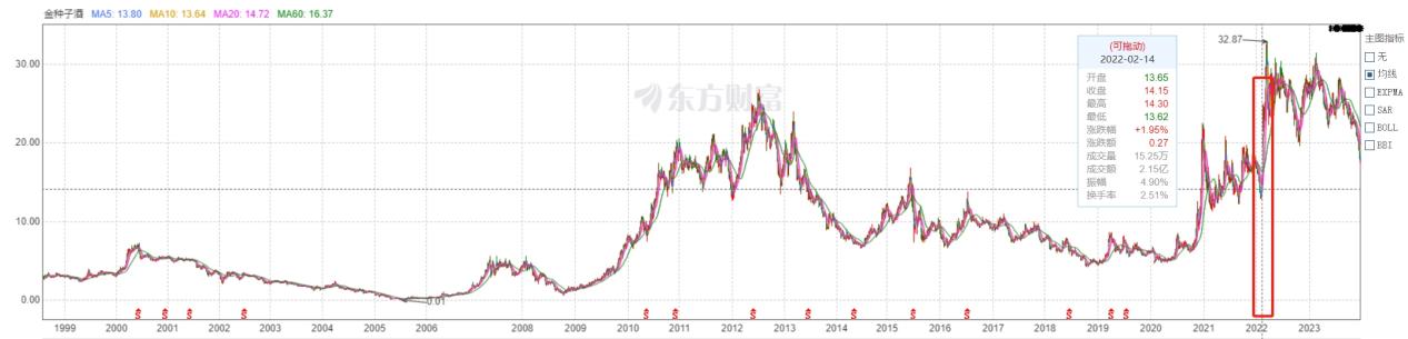 从二级市场表现看,华润战投的入驻,对金种子酒的股价起到催升作用,使得本已有些颓势的股价开始直线上升,并在2022年3月份创出历史高点32.87元/股。