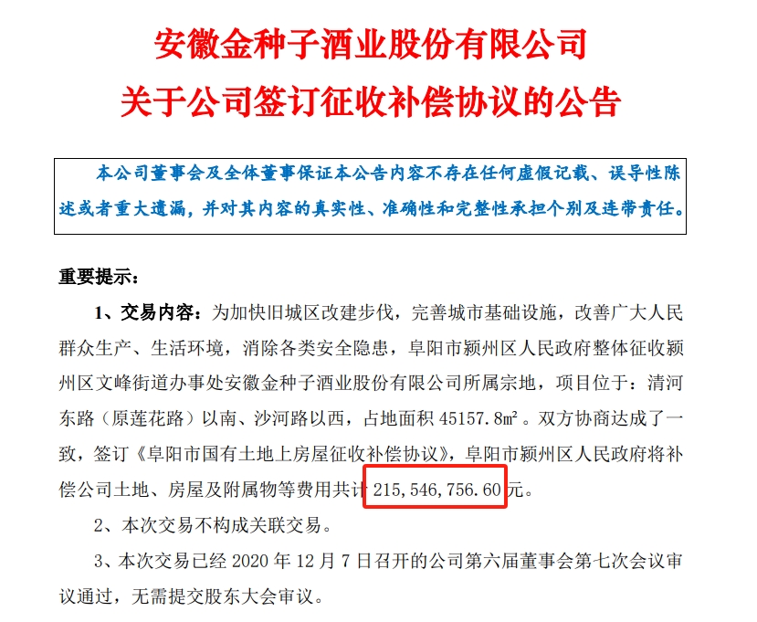 2020年12月,金种子酒发布公告表示,与阜阳市颍州区人民政府达成了协议,将出售公司部分所属土地,同时得到补偿款约2.2亿元。