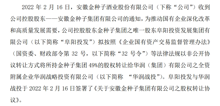 2022年2月,金种子酒发布公告表示,阜阳投资发展集团有限公司(下称“阜阳投发”)拟以非公开协议转让方式将所持金种子集团49%的股权转让给华润战投,并已签订了股权转让协议。