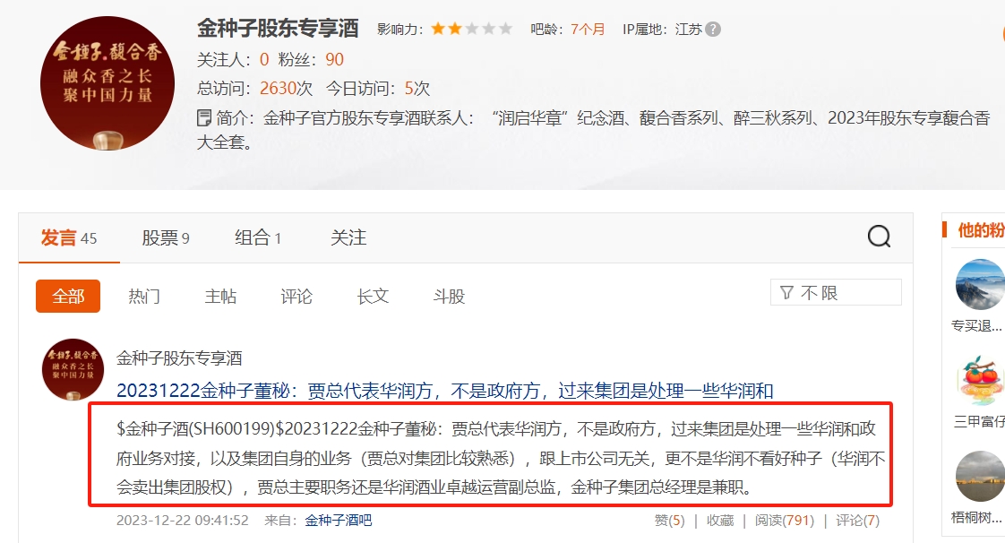 近期,华润拟退出金种子酒的消息在市场上流传。不过,一位ID为“金种子股东专享酒”的投资者分别在东财和雪球股吧转述公司董秘的发言: