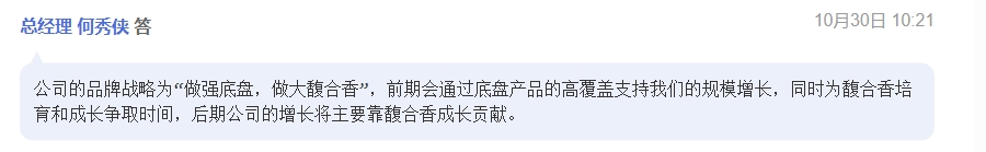 在今年第三季度业绩说明会上,金种子酒总经理何秀侠表示:“公司的品牌战略为‘做强底盘,做大馥合香’,前期会通过底盘产品的高覆盖支持我们的规模增长,同时为馥合香培育和成长争取时间,后期公司的增长将主要靠馥合香成长贡献”。